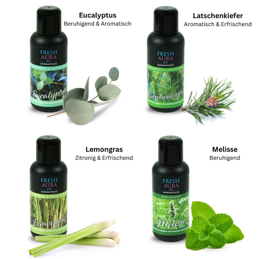 Fresh Aura Saunaaufguss Set Mix mit natürlichen ätherischen Ölen, 4 x 100 ml