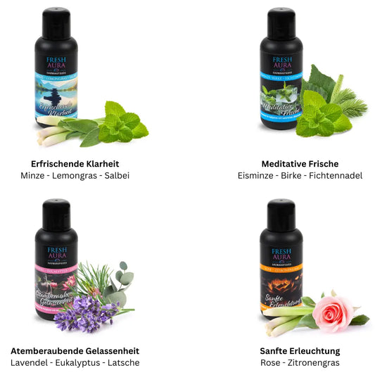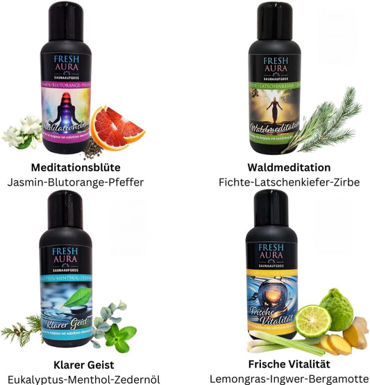 Fresh Aura Saunaaufguss Set Meditative Entspannungsoase mit natürlichen ätherischen Ölen, 4 x 100 ml